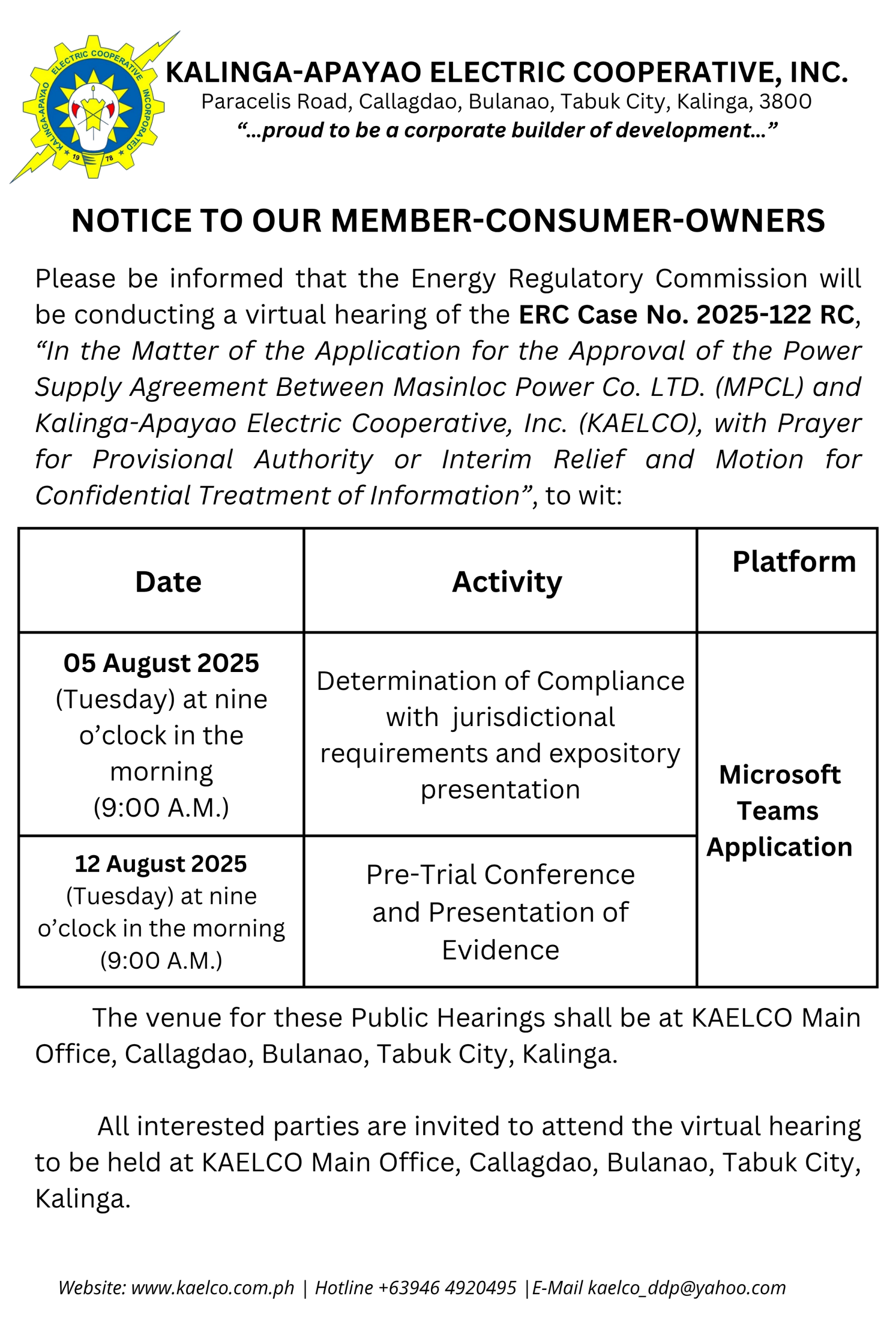 | June 11, 2025 START 9:00 AM END 5:00 PM WEDNESDAY | Dalimuno towards Upper Kalinga (Amlao, Suyang, Paligatto, Balatoc, Magnao, Pinagan, Lucog, Bagumbayan, Naneng, Dupag, Mosimos, Pasil, Lubuagan, Tinglayan, & Balbalan), except Poswoy, Ab-abaan, Tawang, Buaya & Mabaca Balbalan | Line Right of Way Clearing | |||